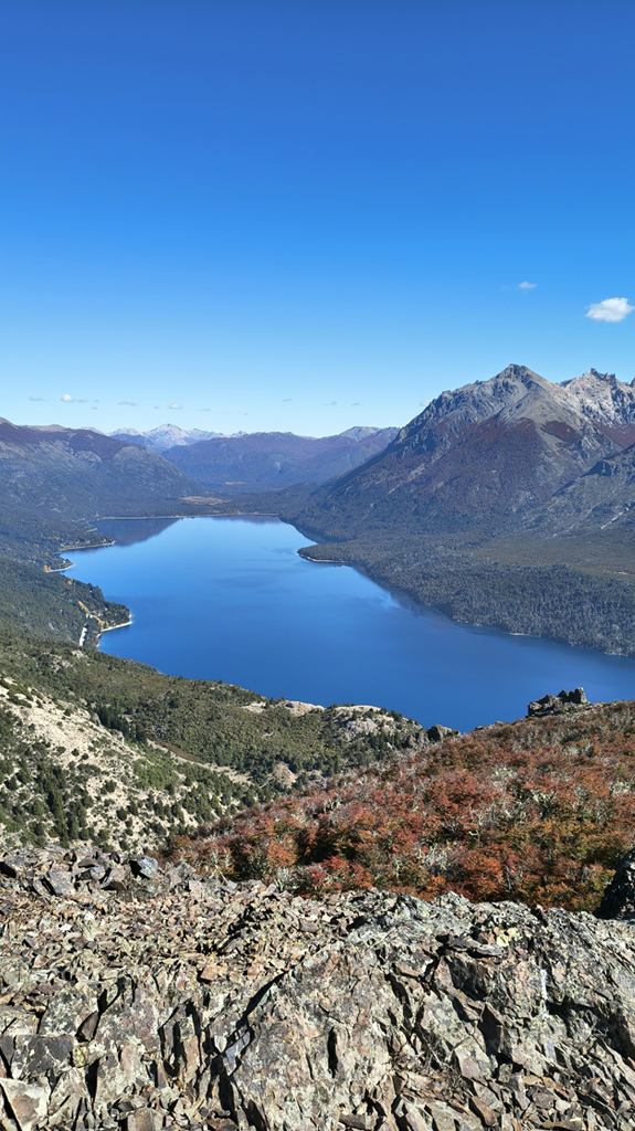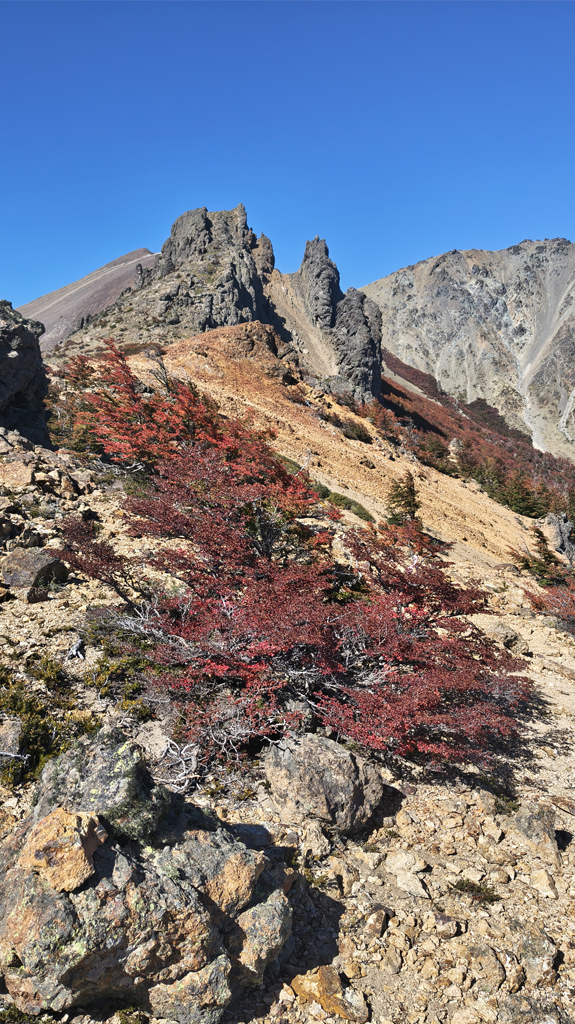 O trekking começa próximo à mítica Ruta 40, a leste de Bariloche, e atravessa bosques de coihues, ciprestes e lengas. À medida que ganhamos altitude, o bosque se abre e dá lugar a um terreno mais rochoso, com vegetação baixa e arbustos patagônicos resistentes. A trilha é estreita e íngreme, com trechos onde, em alguns setores, o caminho pode ficar pouco evidente.