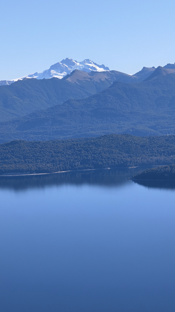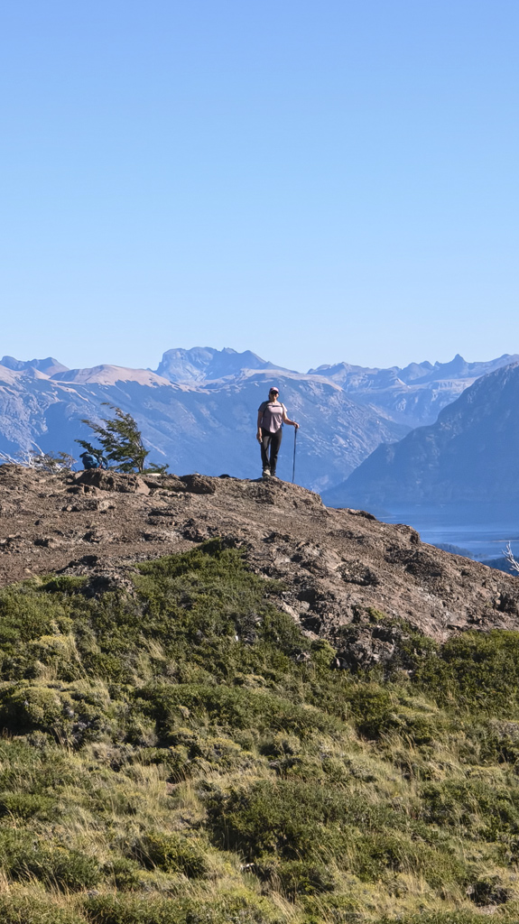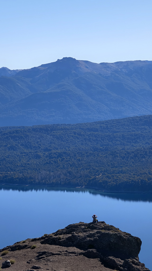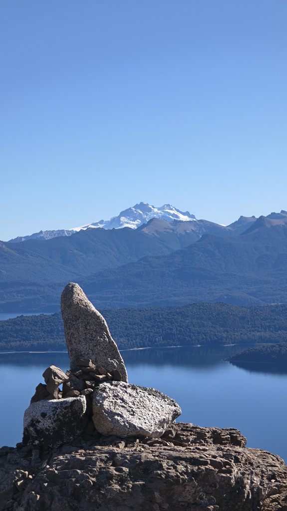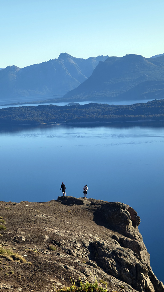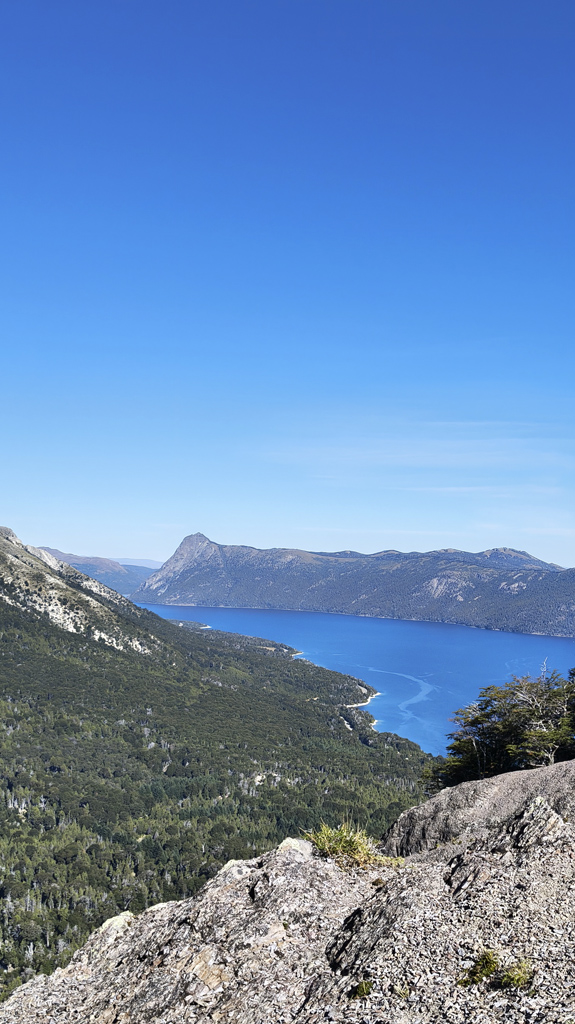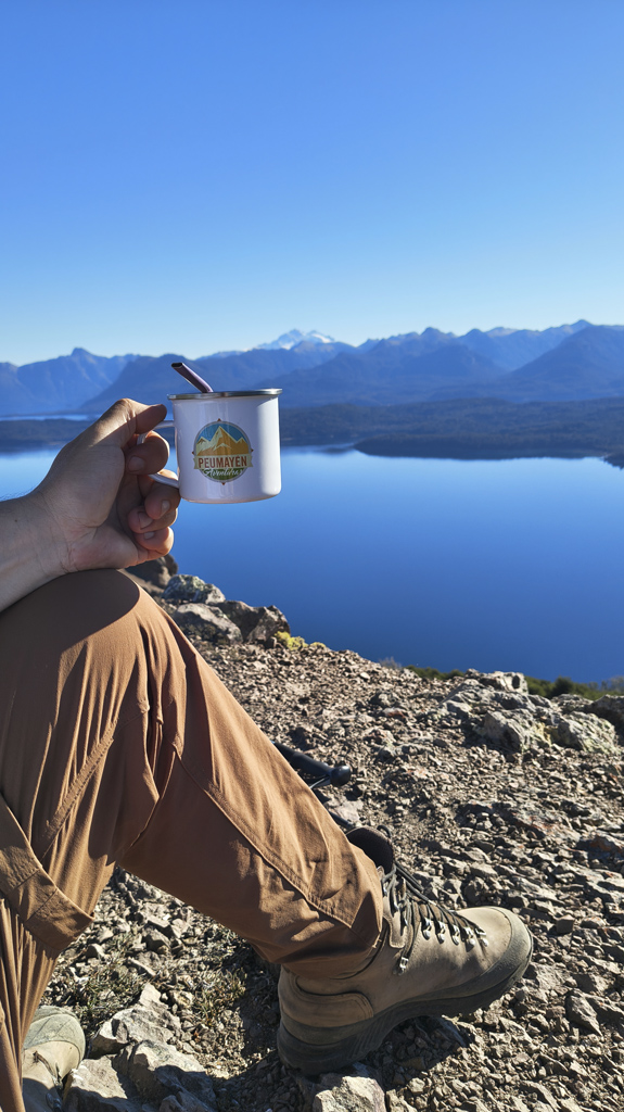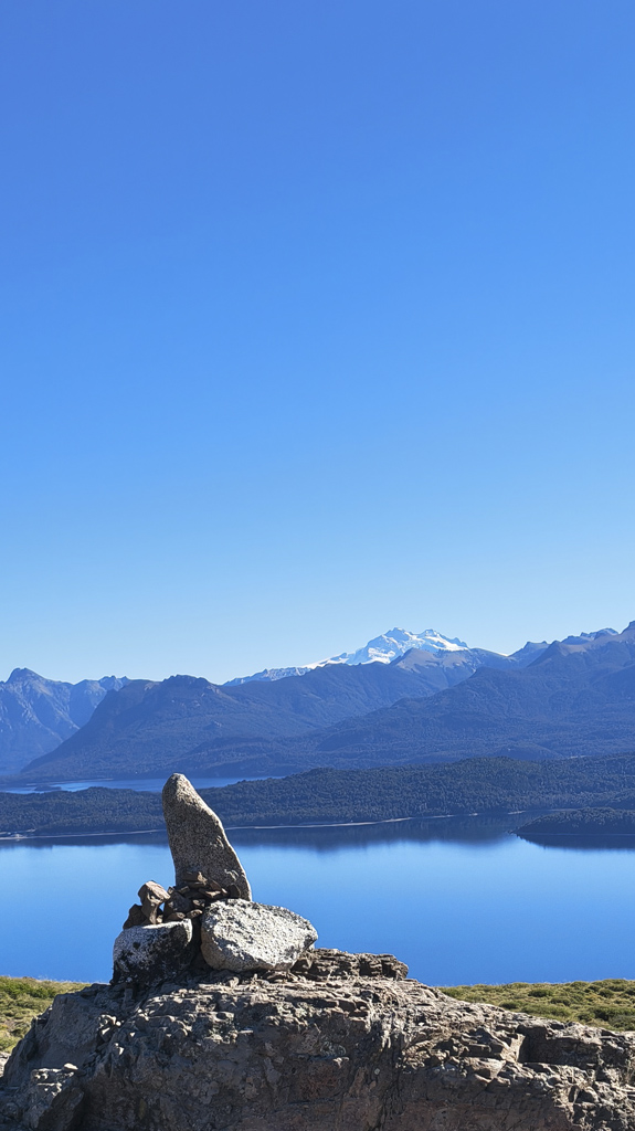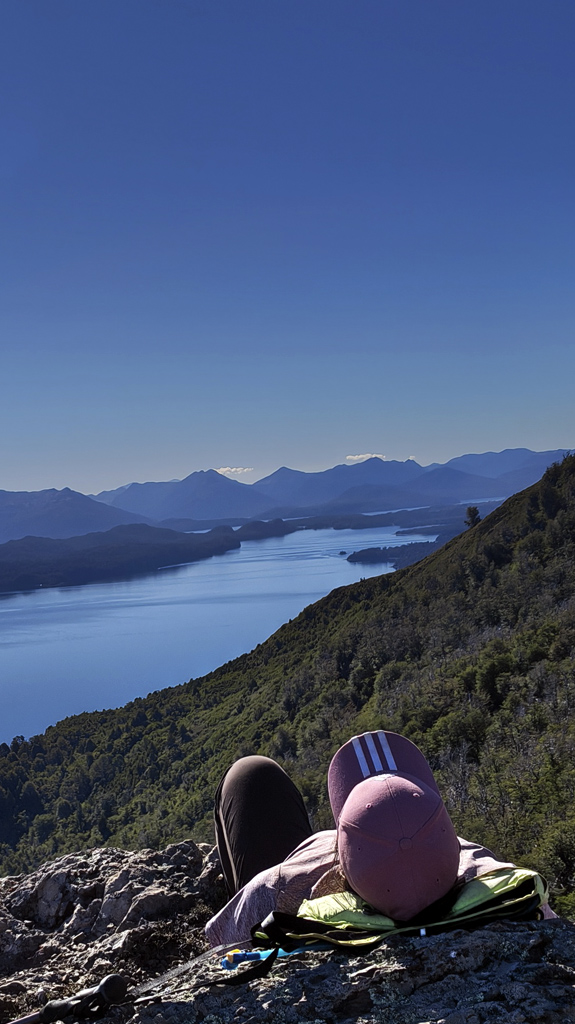 Finalmente, la cumbre nos recibe como un escenario perfecto: la extensión del Lago Nahuel Huapi se despliega ante nuestros ojos, reflejando el cielo y las montañas, mientras la Isla Victoria aparece como un punto verde en medio del espejo azul.
